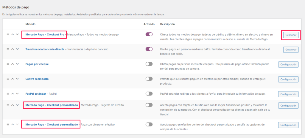 Ahora que ya esta instalado y activado te diriges a WooCommerce > Ajustes > Pagos y elijes alguna de las modalidades que se ofrecen.